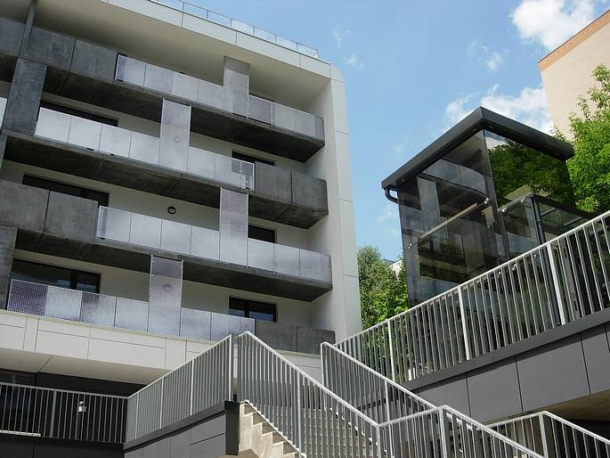 Popri samotnom architektonickom stvárnení (viac o V-podperách nižšie) uvedieme dva postrehy súvisiace s komfortom pre budúcich obyvateľov. Prvým je parkovanie, ktoré je logicky zokruhované a samotné parkovacie miesta ponúkajú vysoký komfort. Šírku státia sme namerali osovo 2,70 m aj 3,00 m, čo je zjavný nadštandard. Na druhej strane je nepochopiteľný výškový rozdiel medzi úrovňou parkovania a prízemím, ktorý treba prekonávať cez schodiskové rameno.