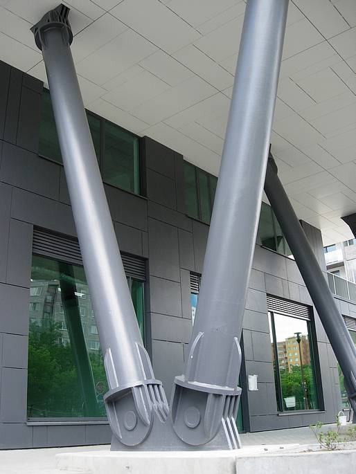 Zrejme najzaujímavejšou črtou Skyboxu sú oceľové dvojice podpier, ktoré podopierajú konzolovo vyložené obytné bloky. Toto riešenie je nápadité a má šmrnc. Každý blok je podopieraný tromi dvojicami podpier, ktoré evokujú tvar písmena V. Podpery sú vyplnené betónom a sú kotvené do 2,5 m hrubej ŽB pätky, ktorá je podporovaná štyrmi 10-metrovými pilótami (klik pre foto). Na okraj uvádzame, že podpery prenášajú najmä tlakové sily.