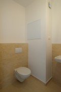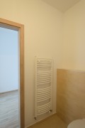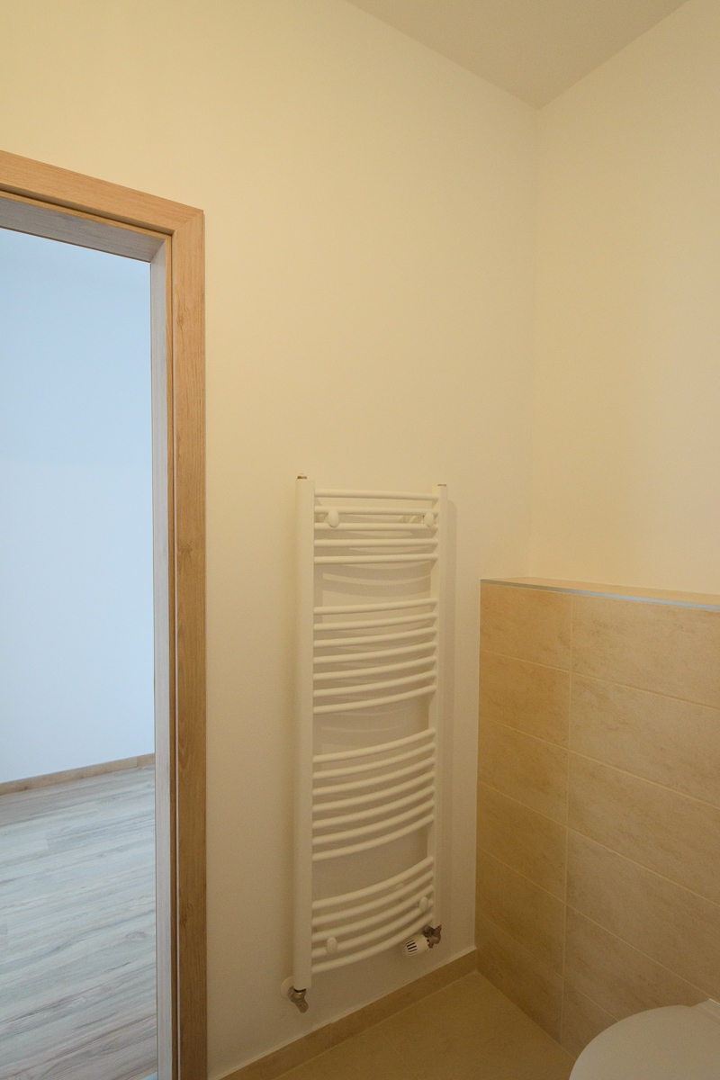 Aby sme mali obrázok o štandardnom vyhotovení obkladov úplný, pozrieme sa naľavo od WC. Je tam stena s rebríkovým radiátorom. Tiež neobložená. Ako asi bude časom tá stena vyzerať, keď obyvateľov napadne prehodiť si na radiátor mokrý uterák, prípadne nejaké odevy?